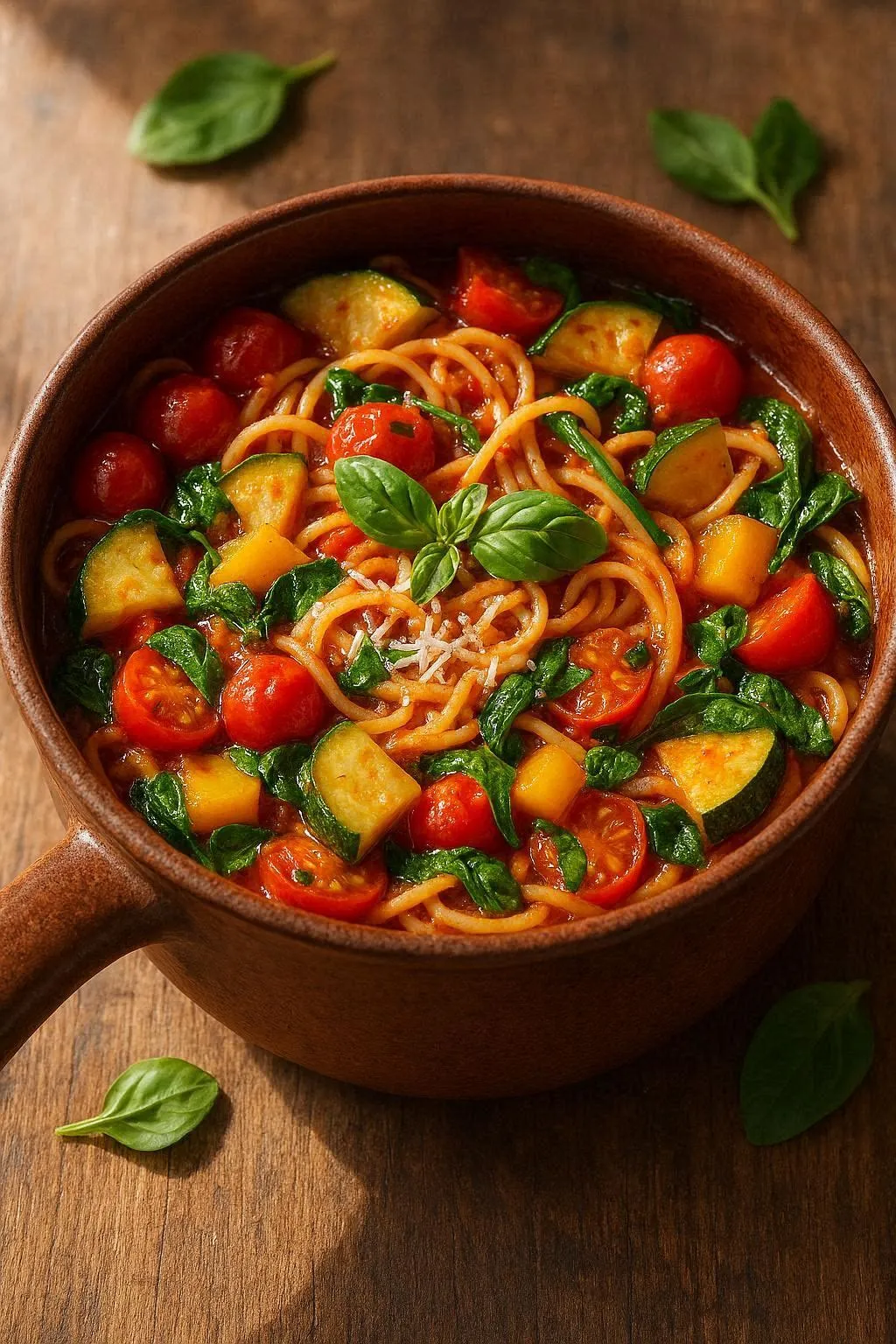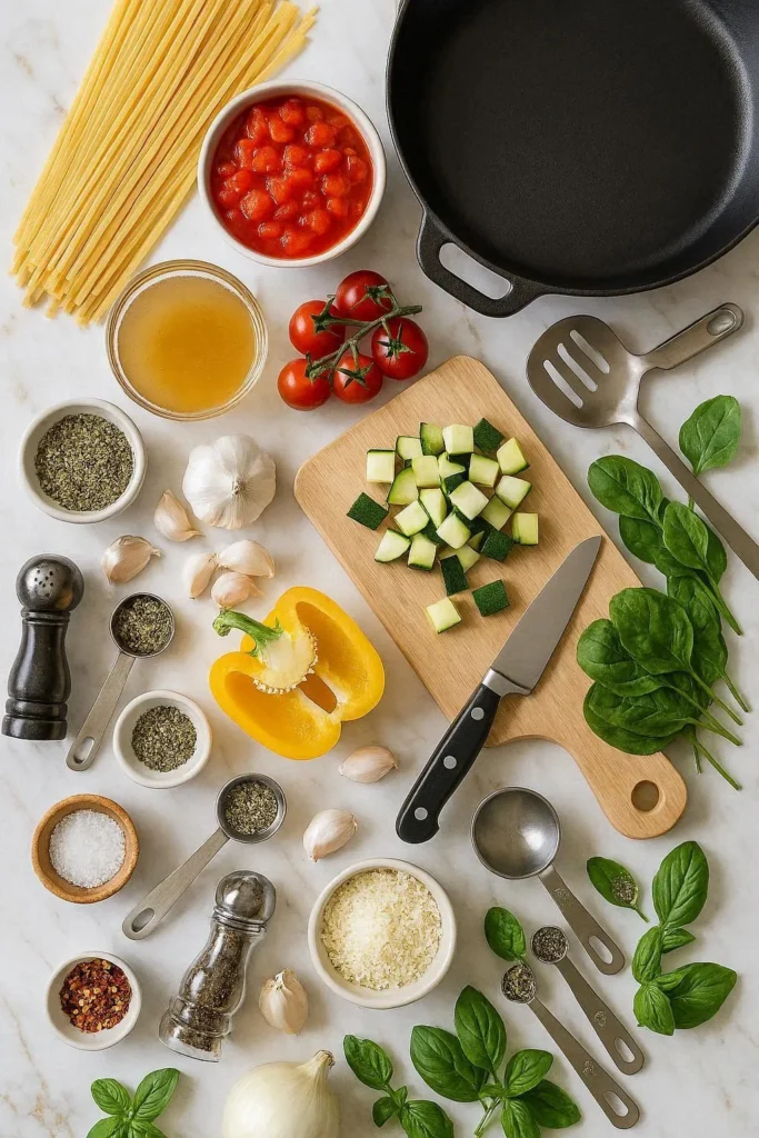 One pot vegetarian pasta sounds like a compromise. Like the kind of meal you make when you’re tired and just need to get food on the table. But here’s what nobody tells you — the pasta absorbs the broth directly as it cooks. Every noodle is saturated with flavor. The sauce? It basically makes itself.