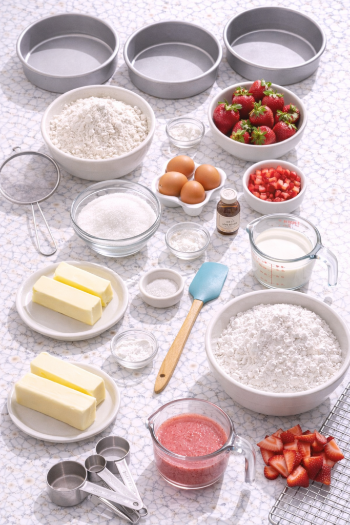 This recipe uses fresh strawberries in THREE different ways. That’s the secret. You’re getting strawberry puree in the cake batter, chopped strawberries folded into the layers, and fresh strawberries on top.