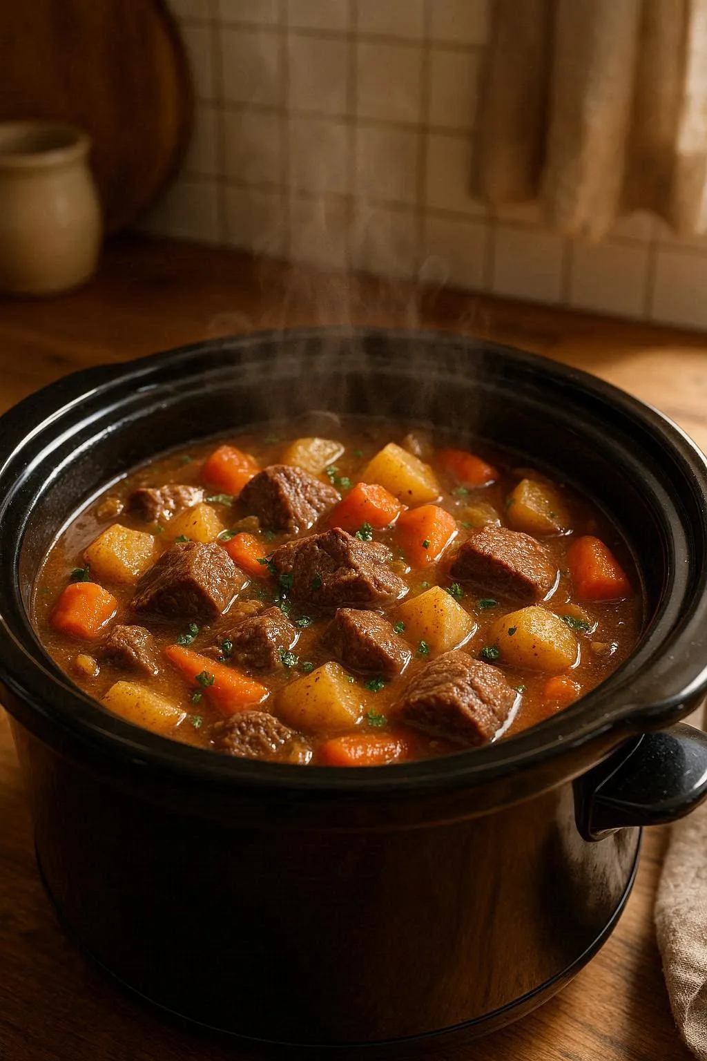 My stew came out watery. What went wrong? A few possibilities: the lid was ajar during cooking, or there was too much liquid. Fix it fast — stir in 1 tablespoon cornstarch mixed with 1 tablespoon cold water, cook uncovered on HIGH for 20-30 minutes.