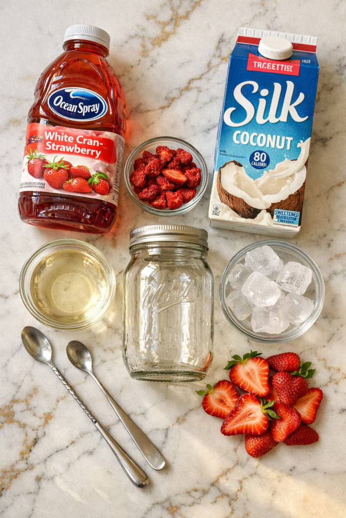 Batch Recipe (Serves 4) Combine 4 cups White Cran-Strawberry juice + 4 cups sweetened coconut milk in a pitcher. Store in the fridge. Pour over ice with freeze-dried strawberries when ready. Give it a stir first — the coconut milk settles at the bottom.