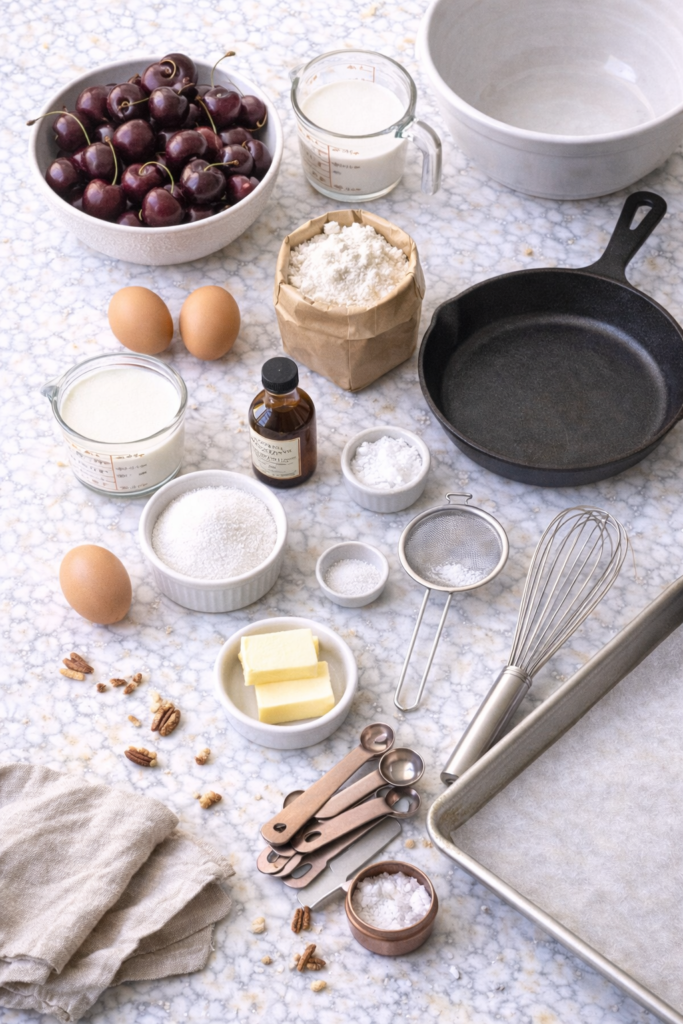 It’s somewhere between a custard, a pancake, and a soufflé. The batter is poured directly over fresh cherries and baked until puffed, golden, and just barely set in the center.